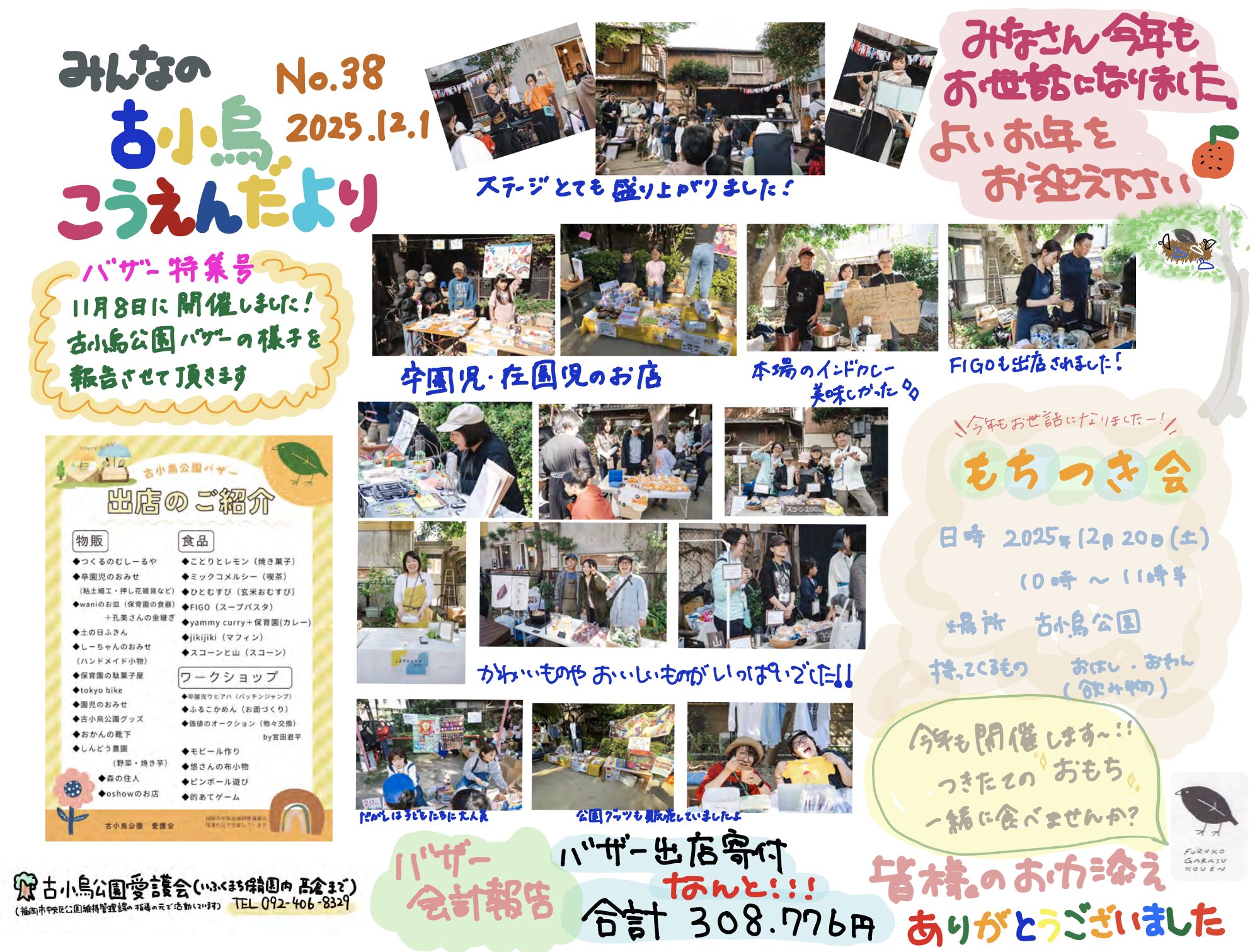 大勢のまちの方々に来ていただき、今年も公園バザーが盛り上がりました。バザーの出店寄付は、合計308,776円となりました。大切に活用させていただきます。(古小烏公園愛護会の口座で管理し、行政の監査も行なわれています)みなさんのご協力、本当にありがとうございました!