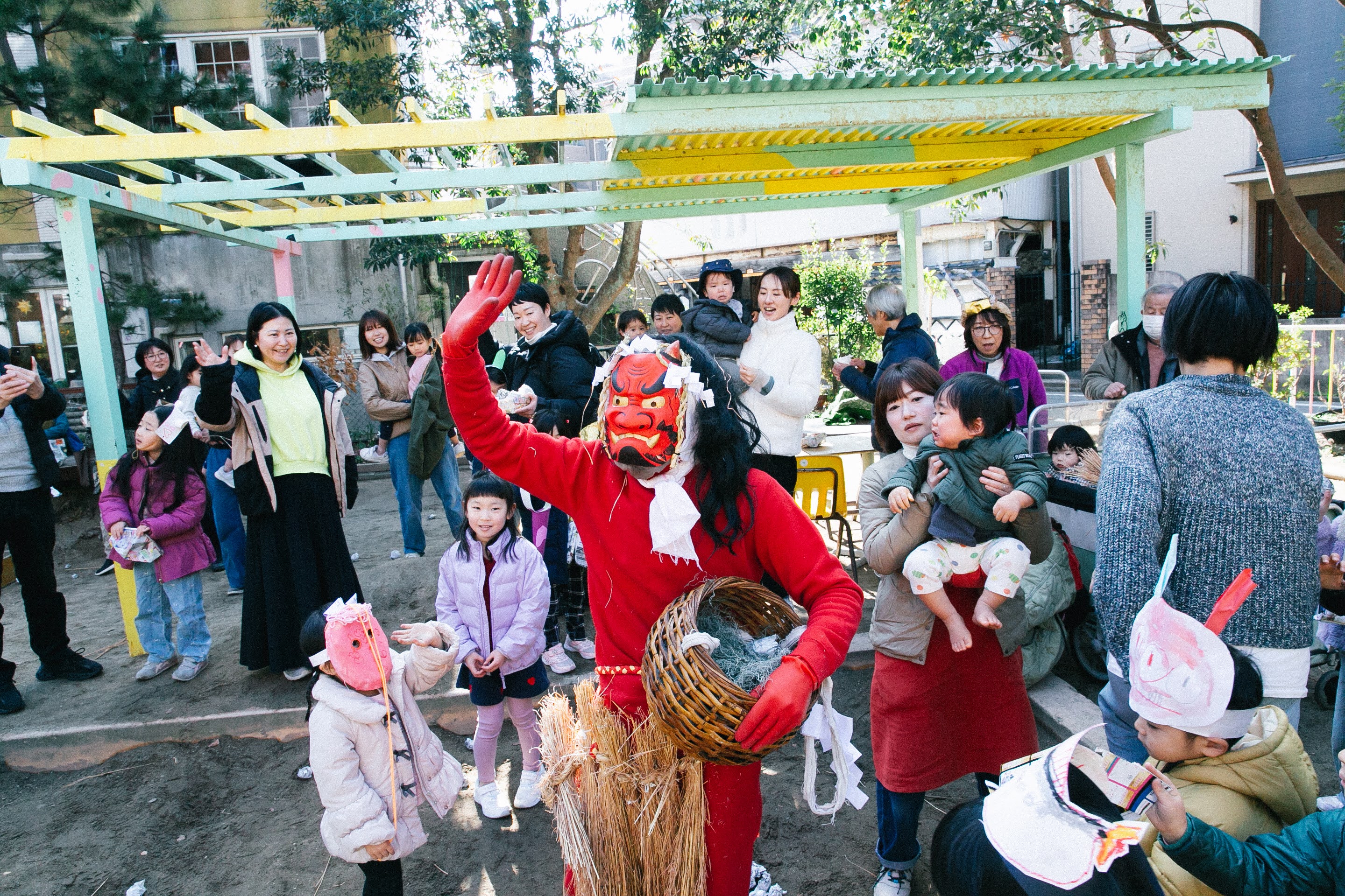 2/3は鬼六がやってきました。公園の隅々までお祓いをしてくれて、みんなに福が訪れるようにと、竹炭を撒いてくれました。面白くて愉快で地球思いの鬼六さんでした。泣いていた子どもたちも、最後は仲良しに。また来年も来てくれるといいな〜
